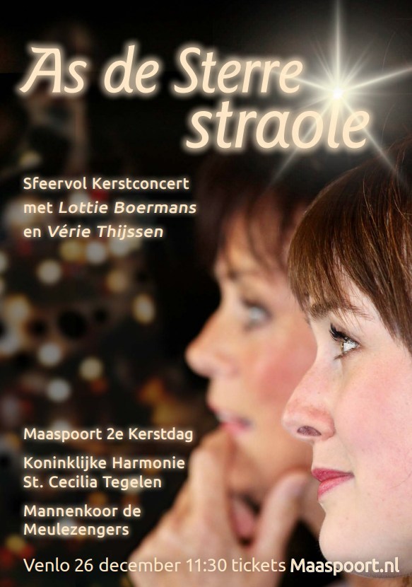 Koninklijke Harmonie Sint Cecilia Tegelen en de Meulezengers maken er weer een feestelijk concert van. Als je een goede plaats wilt hebben moet je niet langer wachten met reserveren: As de sterre straole | Maaspoort